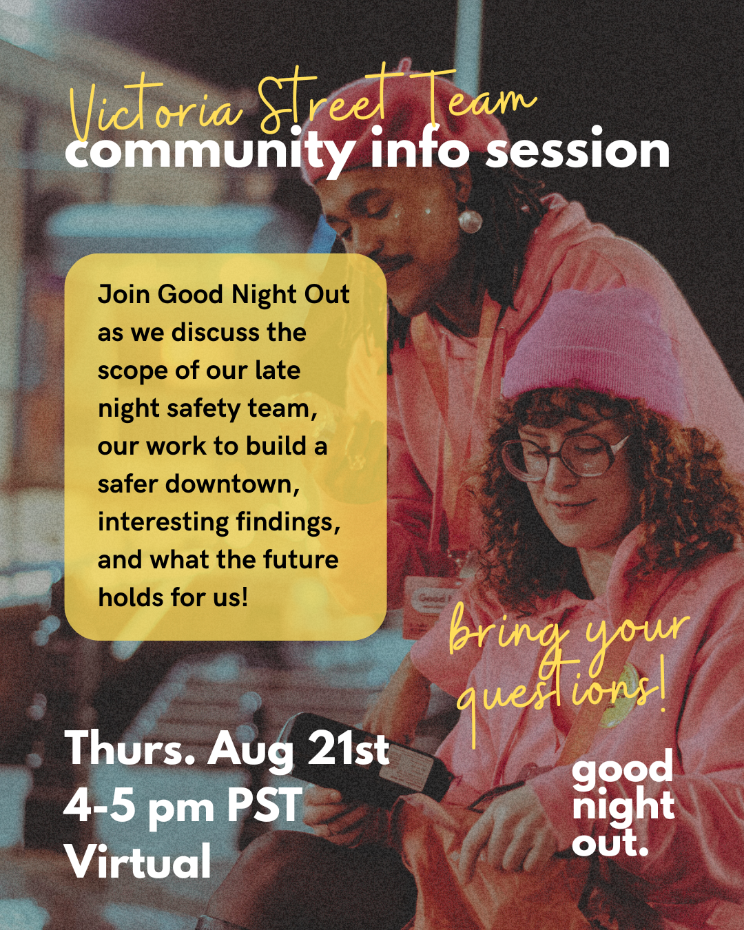 Join Good Night Out for a series of virtual, live, interactive, safety skill-building sessions for hospitality and event workers across Canada. Our monthly sessions start Aug 24 and cost $30 a session (with pay what you can available)! Sign up here