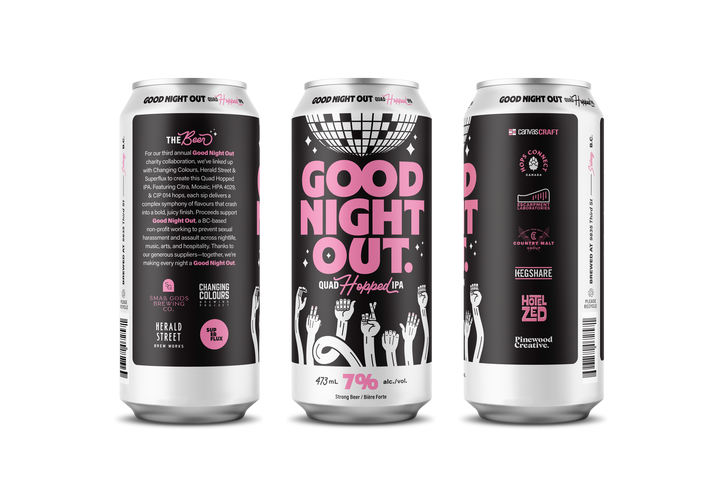 All proceeds from this collaboration support Good Night Out, a BC-based non-profit that is doing crucial work to prevent harassment and create safer spaces in hospitality, music, and nightlife. This project represents what’s possible when our industry comes together to create positive change. Special thanks to the incredible suppliers who stepped up to make this brew possible: Hops Connect, Canada Malting Co., Escarpment Labs, Canvas Craft, Pinewood Creative, Kegshare, and Hotel Zed. Your generous contributions help us do more than make great beer; together, we’re making every night a Good Night Out.